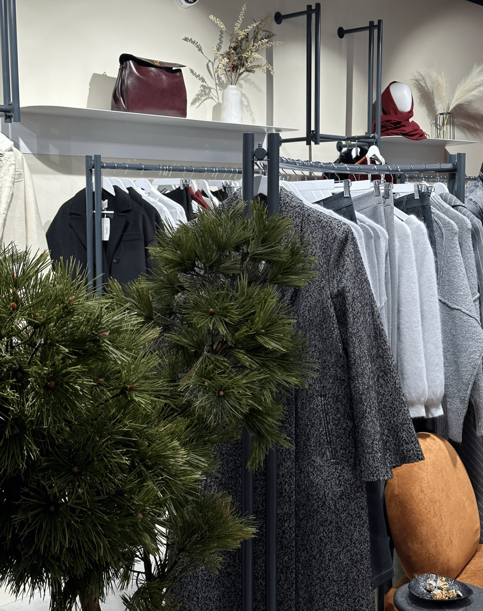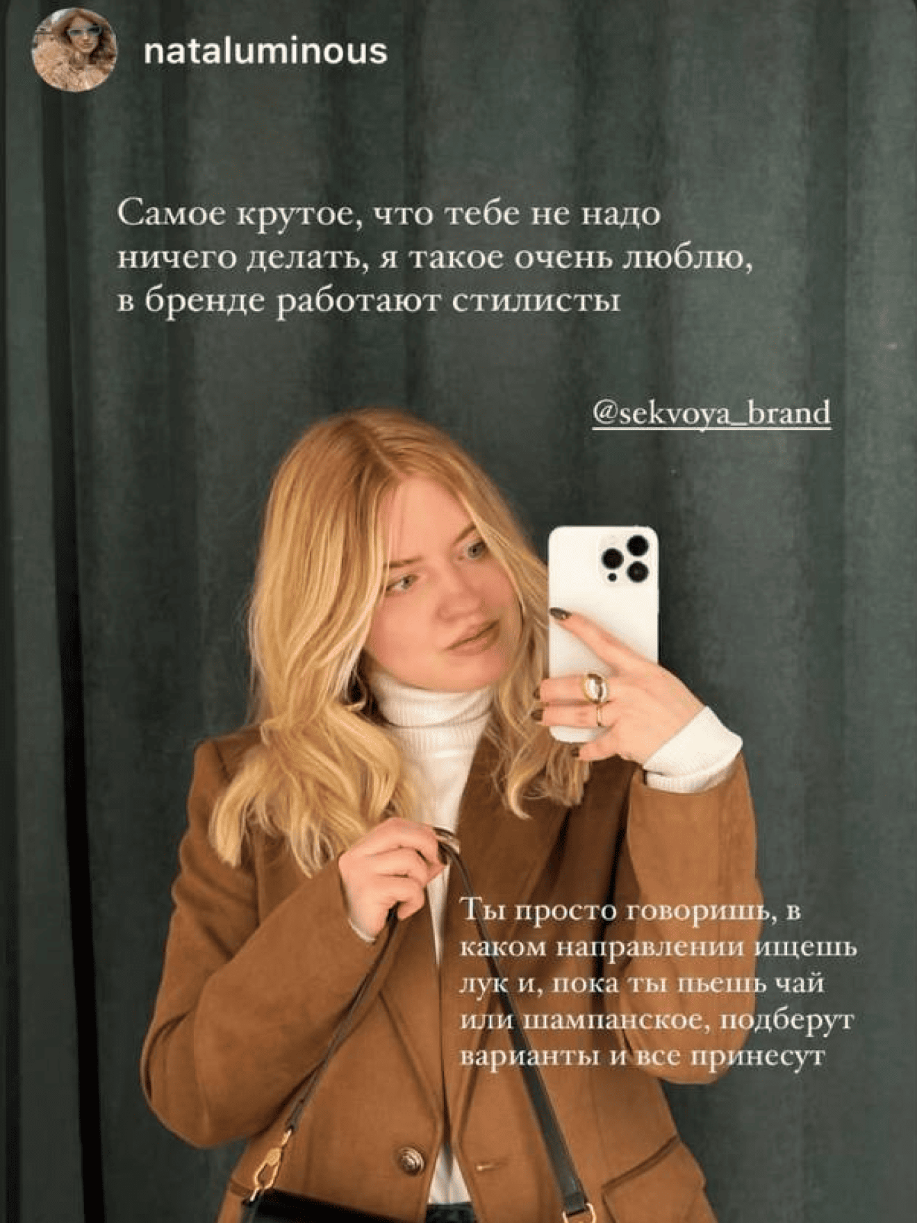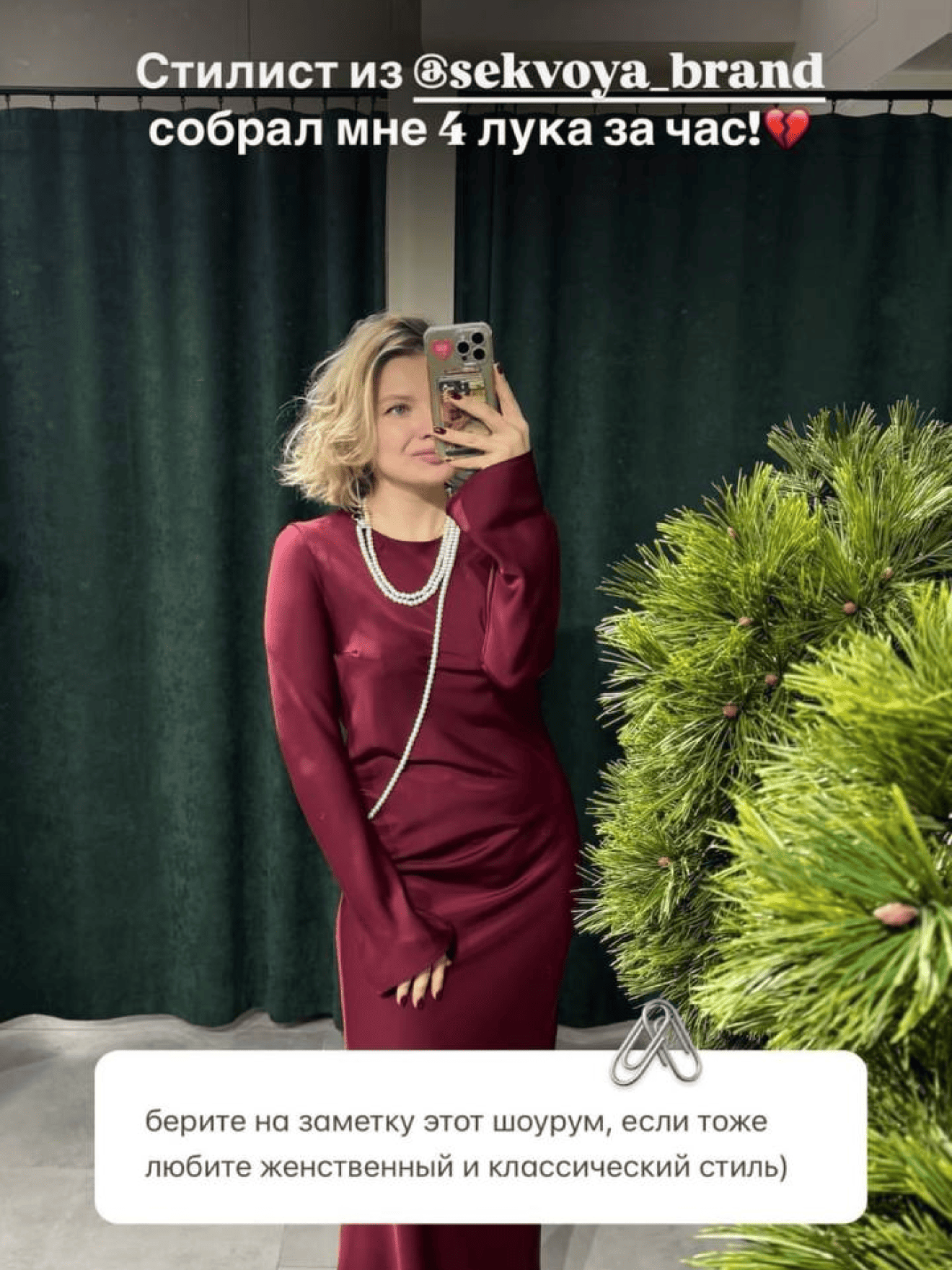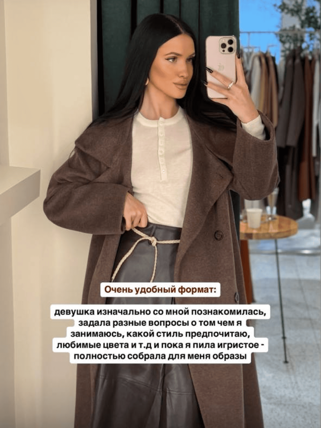 Вы приезжаете в один из наших магазинов.Профессиональный стилист встречает вас с шампанским/чаем и фуршетом. Стилист задает несколько вопросов чтобы понимать ваш запрос, цветотип, тип фигуры и составляет образы